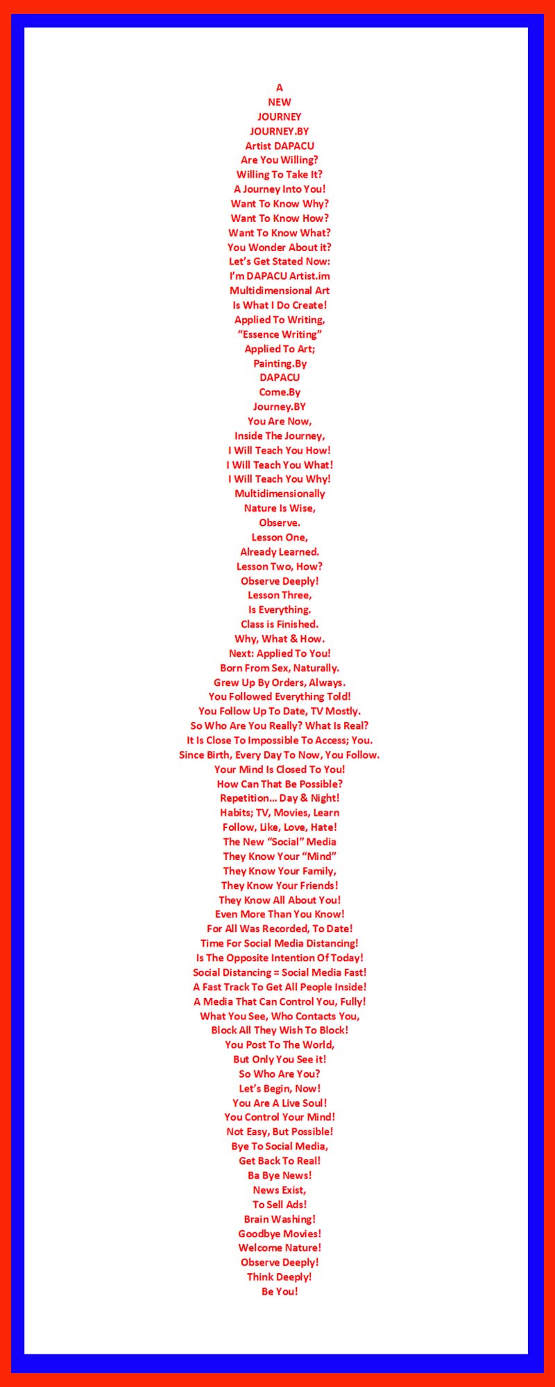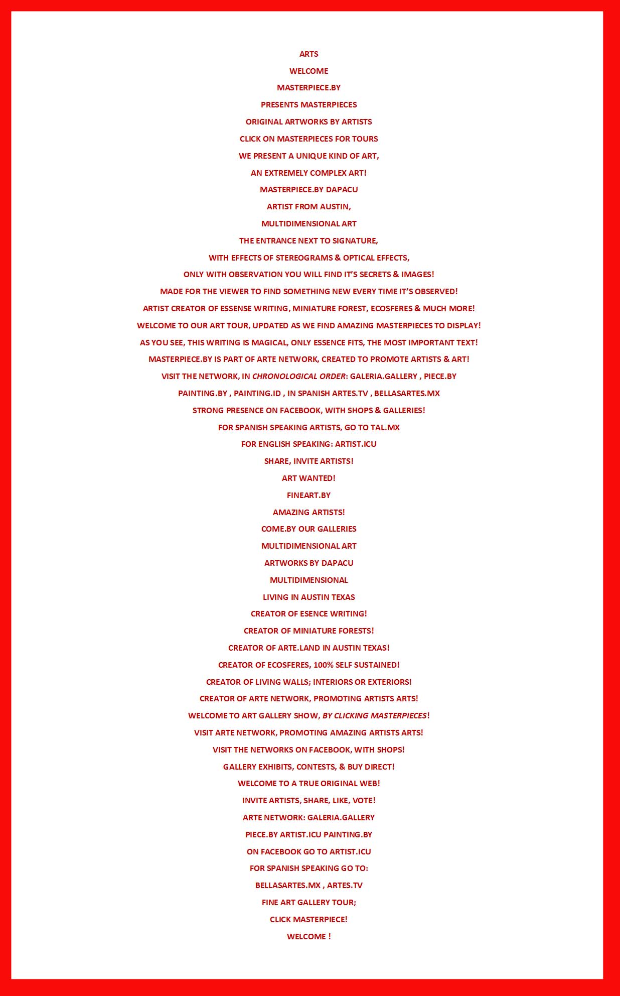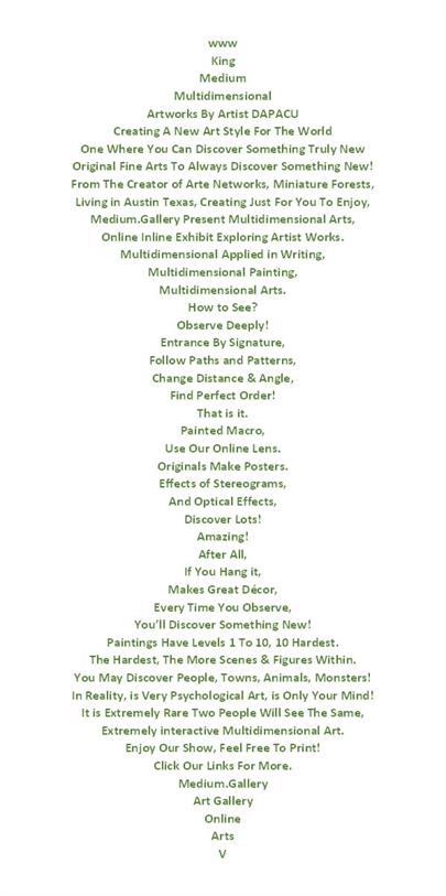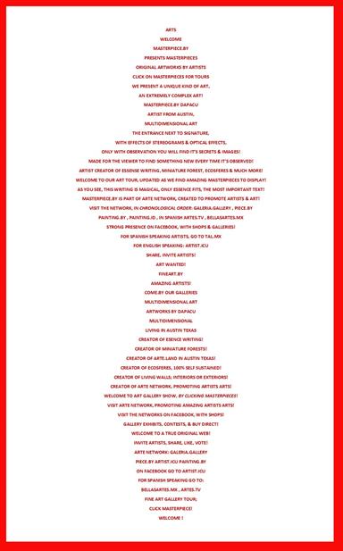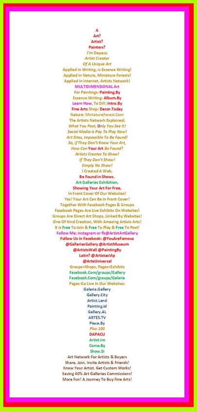 DAPACU's art has been exhibited in various galleries, museums, and online platforms, showcasing the artist's latest masterpieces and unique art style. The evolution of DAPACU's multidimensional art has been presented in exhibitions that highlight the artist's deep and unique approach to creating art, with a focus on nature, writing, and more...