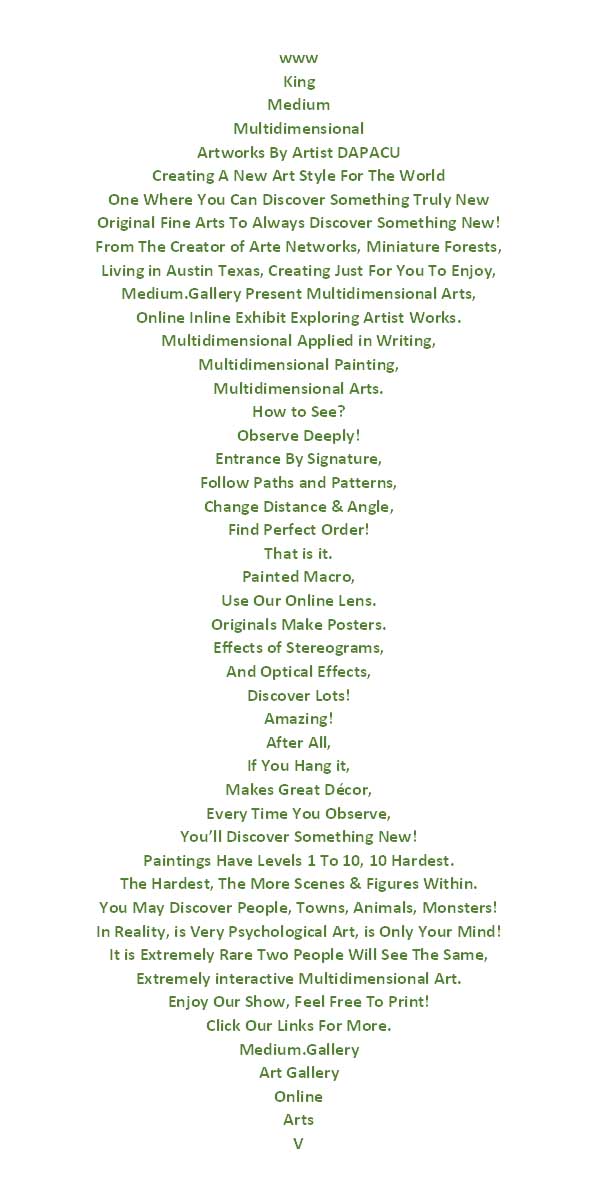 DAPACU is a renowned multidimensional artist known for creating visually captivating and immersive artworks. With over forty years of experience in painting, DAPACU's art is characterized by its highly detailed and extremely complex nature, often incorporating optical effects, stereograms, and a unique blend of traditional and modern techniques, creating one of the most complex arts you will ever find.